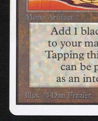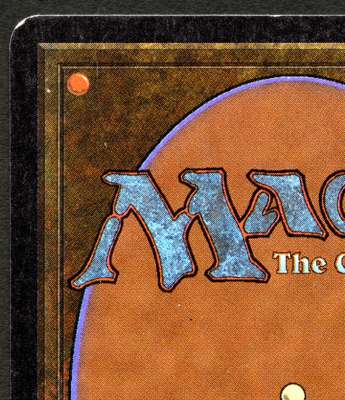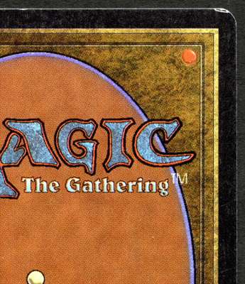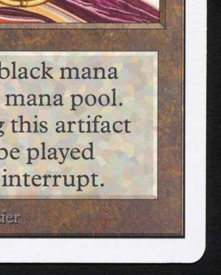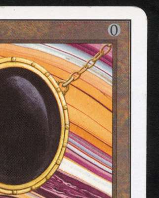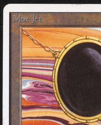 This Mox Jet has incredibly vibrant colours and is generally in very good condition. it has very minimal signs of wear in select places on the front and back of the card, this would leave us to grade it at excellent condition however on the lower right back of the card you can see where its been ever so slightly bent over a ring of a ring binder. While there is no real damage you can feel it if you place you finger on the card.