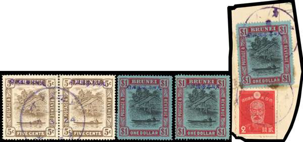 Japanese Occupation. 1942-4 5c chocolate horizontal pair, the right stamp with ‘5c’ retouch, 'used but sadly with a forged postmark; two mint examples of the $1, each with the usual slight toning of the gum, one with the R6/4 sky retouch at left; and a used $1 on piece with unoverprinted Japanese stamp, this with some foxing. SG J6a, 17