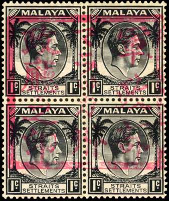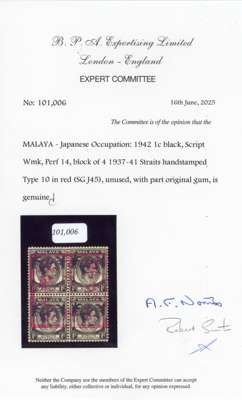 1942 Straits 1c black block of four with full Malacca Chop. Part to large part o.g., each with the discreet Bowie guarantee on reverse and with BPA Certificate (2025). SG J45