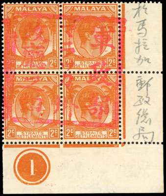1942 Straits 2c orange lower right corner Plate block of four with full Malacca Chop. Large part o.g., the corner stamp with a small gum thin, nonetheless a scarce and attractive multiple. BPA Certificate (2025). SG J46