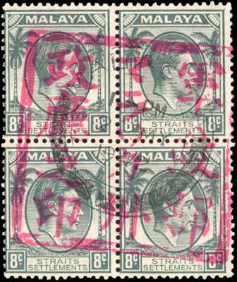 1942 Straits 8c grey block of four with full Malacca Chop, Malacca 2 MY 1942 CDS. BPA Certificate (2025); rare multiple. SG J49