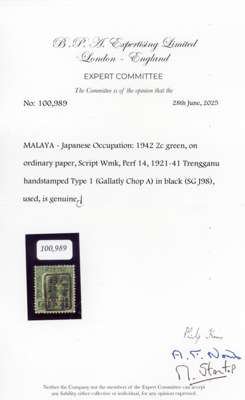 1942 Trengganu 2c green on ordinary paper, Chop A in black, lightly used. BPA Certificate (2025). SG J98, £170