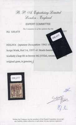 1942 Straits 10c dull purple, chop ‘H’ in BROWN, mint, part to large part o.g., small mark on reverse otherwise a fine example of this rarity. BPA cert (2025). SG J152a, cat £1600