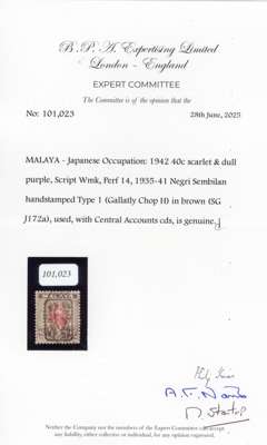1942 Negri Sembilan 40c scarlet and dull purple, Chop H in brown. Used example with part Central Accounts CDS. A rare stamp, BPA Certificate (2025). SG J172a, £1300