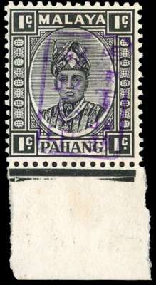 1942 Pahang 1c black lower marginal, Chop A in violet. Large part o.g., hinged low on the stamp otherwise fine. With original SG sales card. SG J176b, £450