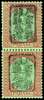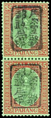 1942 Pahang $5 green and red on emerald paper vertical pair, Chop A in black, large part o.g., the lower stamp unmounted with tiny gum disturbance. The upper stamp with slight doubling, dismissed on the accompanying BPA Certificate (2003) as ‘…. not double, but a single smudged impression.’ Ex Tompkins. Rare. SG J189, £2000