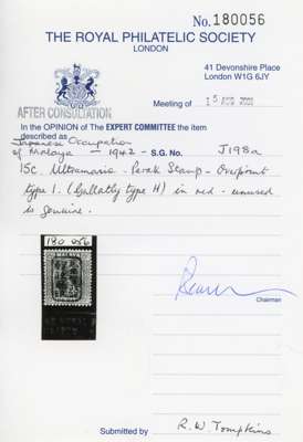 1942 Perak 15c ultramarine with Chop H in red, large part o.g. Ex Tompkins, RPS Certificate (2001). SG J198a, £300