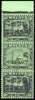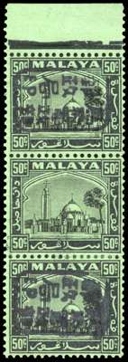 1942 Perak 50c black on emerald paper top marginal vertical strip of three, Chop in black, omitted on the central stamp. O.g. with some reinforcement between the lower pair. SG J202 var