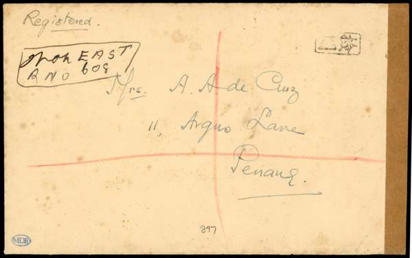 1942 registered cover to Penang with (on reverse) 8c Perak and 15c Selangor tied by cogwheel PERAK/ YUBIN KYOKO CDSs, Proud JD2 (centres faint). IPOH EAST manuscript registration mark on front, minor spotting, ex Rowell