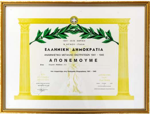 Sold with Box for Greek War Medal, Framed and Glazed, Award Certificate for Greek War Medal, original letters from the MoD and Hellenic Embassy, London, and a resumé of his Service and the RSR.