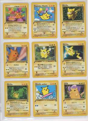 This lot contains two premium products released in 2000, the Pikachu Worlds collection, a set that features nine Pikachu cards each printed in a different language that the trading card game was printed in back in the year 2000. It also includes the cards from the Neo Premium file 2, this set was exclusively printed in Japanese and features the coveted Charizard. Both sets are missing their outside slip case but the cards are still in near mint to light played condition.