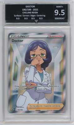 This lot contains the full art Doctor trainer, #190/198 from the English Chilling Reign expansion, released in in 2021. It is graded by UK grading company Get Graded and achieved a Mint+ 9.5.