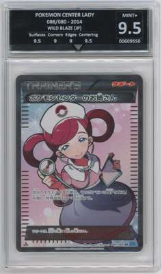 This lot includes the Japanese Pokémon Center Lady from the Wild Blaze expansion, originally released in 2014. The card is graded by the UK grading company Get Graded and achieved a 9.5 Mint+ grade.