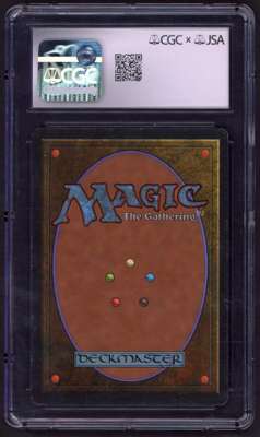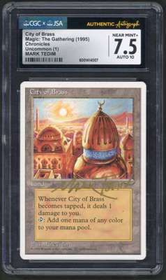 This lot features the original pain land, City of Brass! This copy is from the 1995 Chronicles Edition and has been signed by one of the most iconic Magic artists ever, Mark Tedin! The card has been authenticated and graded by CGC and has been awarded a 7.5 Near Mint+ with the authentic Autograph signature scoring a perfect 10! Tedin's signature is featured in gold pen and ironically enough his second name is misspelt ‘Tedim’ on the CGC label.