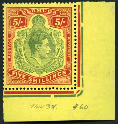 1937 (Nov.) 5/- green and red on yellow paper, corner example, #60, large part o.g. SG 118, cat £150