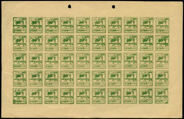 1943 Farmer 2c yellow-green in imperforate sheet of 50 with various minor plate varieties identified (SG J74 vars), unused without gum (as printed), fine and scarce