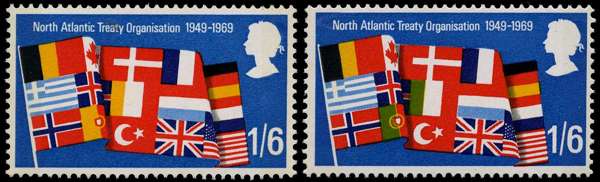 1969 1s6d Anniversaries (2nd series) yellow-green (from flags) omitted, offered with normal for comparison fine unmounted o.g. SG 794f £85