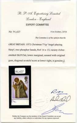 1972 7½p Christmas, angel playing harp, ochre omitted error, lower marginal example BPA cert (2018) fine unmounted o.g. SG 915a £250