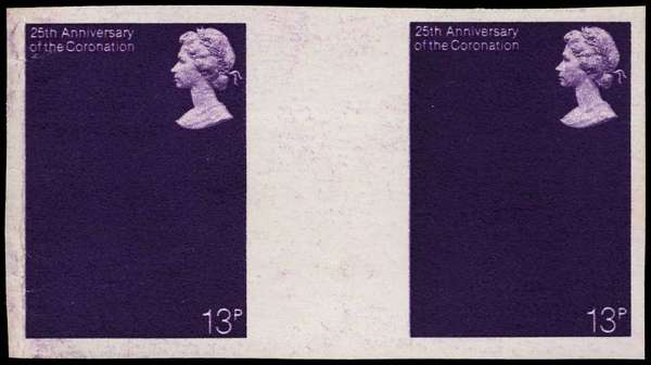 PROOF: 1978 13p 25th Anniversary of the Coronation horizontal imperforate gutter pair, gold omitted. Creasing at left, full o.g. scarce. SG 1062var