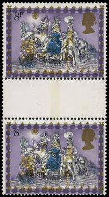 1979 8p Christmas, The Three Kings, gutter pair with vertical gold and perforation shift, fine unmounted o.g. SG 1104var