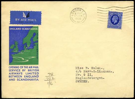 1936 First Flight printed cover "OPENING OF AIR MAIL SERVICE BY BRITISH AIRWAYS LIMITED BETWEEN ENGLAND AND SCANDANAVIA" with 2½d blue franked London "17 MCH/1936". Hoglandstorget arrival mark "18. 3. 36" on reverse. Fine appearance, opened at bottom.