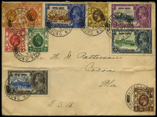 1935 cover to USA franked by 1ct brown, 2ct blue-green, 4ct carmine-red, 6ct yellow-orange, 8ct orange, 12ct purple/yellow and Silver Jubilee set to 20ct slate and purple, neatly tied by numerous strikes from Victoria Hong Kong cds for 24 JY 35, horizontal crease, otherwise an attractive multicoloured franking. SG 103-136