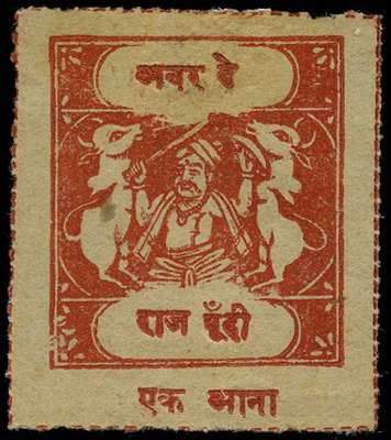 1917 1a vermilion with OUR DAY in top tablet, RAJ BUNDI in lower tablet and ONE ANNA beneath, issued in connection with the 'Our Day' Red Cross Society Fund. Unused example with minor separation irregularity at top, and an inclusion, still a good example. See footnote after SG 25 (£350)
