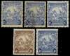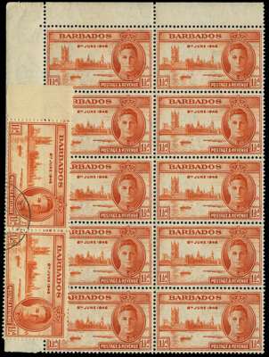 1938-47 2½d blue with R1-3/3 mark on central ornament unmounted o.g. (brownish as always) and fine used, 2½d ultramarine with same variety o.g., 3d brown perf 13½ x 13 with R4/10 line over horse's head (one shortish perf, a bit extensively hinged), and 3d blue with same variety unmounted o.g. Also 1½d Victory 'two flags' unmounted o.g. corner block of ten, and marginal pair fine used. SG 251a (2), 251bb, 252a, 252ca, 262a (2), £547