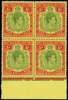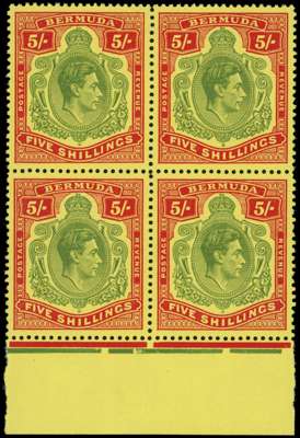1950 5s perf 13 yellow-green and red on pale yellow bottom marginal block of 4 showing positions 38-39 and 50-51 HPF 50ii (CW 23a) fine o.g. SG 118f £140