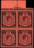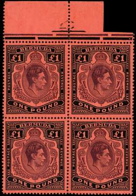 1950 £1 deep reddish purple and black on pale red, part top marginal block of 4 showing positions 6-7 and 18-19 (CW 16c) fine unmounted o.g. SG 121c £240