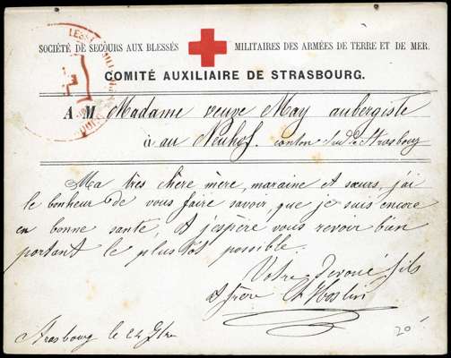 1870 Red Cross card to Neuhof Strasbourg bearing "SOCIÉTÉ DE SECOURS AUX BLESSÉS MILITAIRES / COMITÉ AUXILIAIRE STRASBOURG" cancel in red lightly and partially impressed, some ageing, nevertheless a scarce item