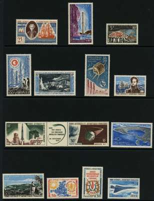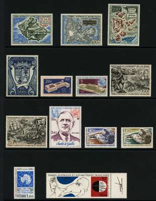 1960-85 unmounted mint selection arranged on two Hagner pages including 1963 IYQS Air 100f, 1965 Air Discovery of Adèlie Land 50f, ITU Air 30f, 1968 Dumont D'Urville commemoration 30f, Air 50f Port-aux-Français, Kergeulen (3), 1969-71 Air to 500f, 1976 Discovery of Crozet and Kerguelen pair. Fine. (27)