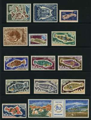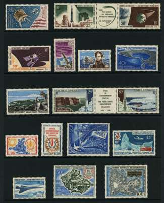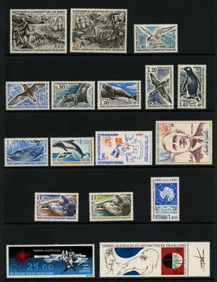1960-85 unmounted mint selection arranged on four Hagner pages including 1960 Leopard seal 25f, 1963 IYQS Air 100f, 1965 Air Discovery of Adèlie Land 50f, ITU Air 30f, 1968 Black-browed albatross 20f, Dumont d'Urville commemoration 30f, Air 50f Port-aux-Français, Kergeulen (3), 1969-71 Air to 500f, 1976 Discovery of Crozet and Kerguelen pair. Fine. (67)