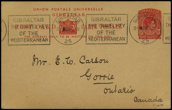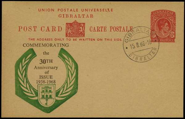 Postal Stationery. 1938 1½d card. Three examples, one SPECIMEN; one used 1938 to Canada, and one overprinted for the 30th Anniversary of Issue, CTO'd 1968. H&G 32