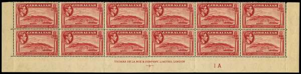 1938 1½d carmine, perf 14. Mint bottom two rows of sheet (vertical folds) with Plate 1A and imprint, o.g., reinforced between right stamps and selvedge otherwise unmounted. Usual gum. SG 123, £420