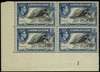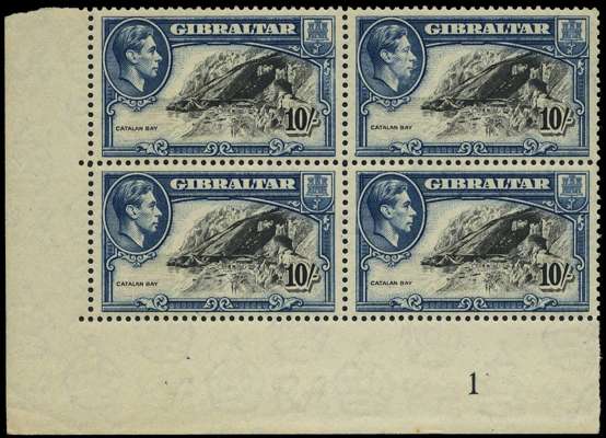 1943 10/- black and blue, perf 13, unmounted o.g. lower left corner block of four with CP1. Internal bend affects R10/2, otherwise very fine. SG 130a, £168