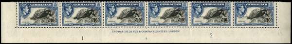 1943-51 10/- perf 13 bottom row of sheet with CP1 - FP2 and imprint, vertical folds. O.g., hinged on the two outer stamps only. SG 130a, £252
