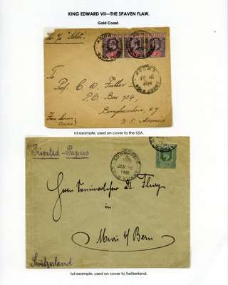 1904 cover to USA with strip of three 1d dull purple and carmine, the right stamp with R1/3 LP Spaven flaw (minor corner crease and equally minor perf staining); and single 1907 ½d green, paying Printed Paper rate to Switzerland, with the same flaw, centrally vertical fold. Unusual to find these on cover. SG 39a, 59a