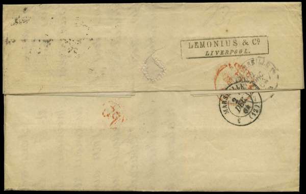 1864 (30 Nov) entire letter addressed to France franked with 1862-64 4d bright red (SI) tied by Liverpool S1 duplex, 'PD' in circle and Calais transit cancels alongside, the reverse with transit and arrival cancels. Good. SG 81
