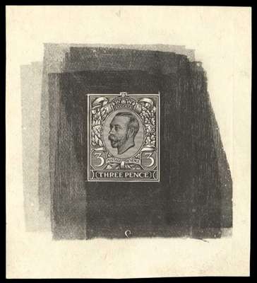 1911 3d Engraver's sketch die for unissued value. Very fine uncleared example with shaded background to head and upper corners, showing part reversed "2" below design. Printed in black on white proof paper. Scarce. Spec. Fig. 23.