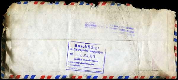 CRASH COVER: 1973 Hong Kong $1.30 on airmail cover to W. Germany, cover salvaged from Lufthansa crash at New Delhi 20th December 1973: some charring with bottom edge missing, with purple cachet " SALVAGED MAIL LH-645 DATED 19-12-73/CRASHED AT DELHI AIRPORT ON 20-12-73" and W. German delivery mark '8. JAN. 1974' on reverse.
