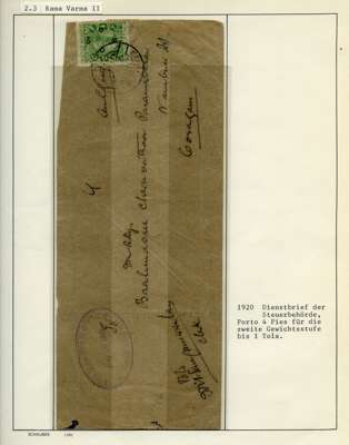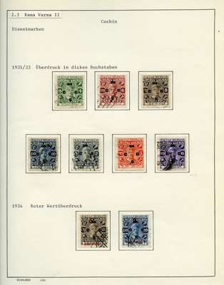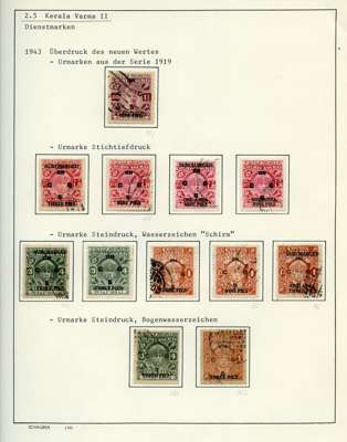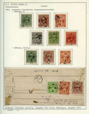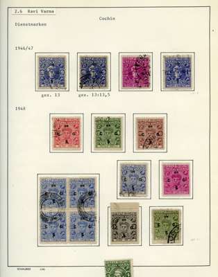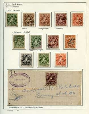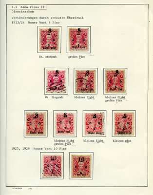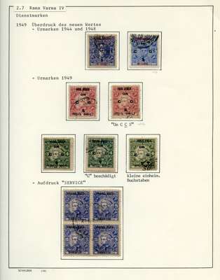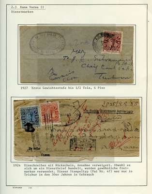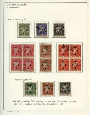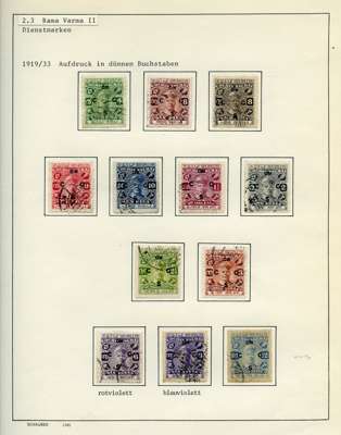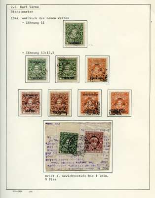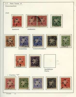 Officials. 1913-49 collection on leaves, written up in German. 170 used stamps plus mint block of 44 of SG O92, five covers and two Hundis. Better items include SG O9, 20a (slightly stained), 57, 65, 66 (corner crease), 67, 67b (rather tired), 68b (pink wash at lower right), 70, 99, well worth viewing
