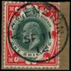 1902-11 1s green and carmine tied to paper piece by complete 22mm no code Ascension cds for 'SP 11 12' SG Z33 £200