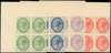 1879-80 Tender Essay: 1d essays based on DLR Inland revenue design produced by Charles Skipper & East as top left marginal blocks of four on thick wove in green, blue, lilac and red, attractive and scarce.
