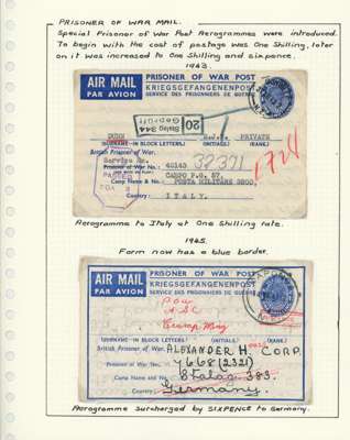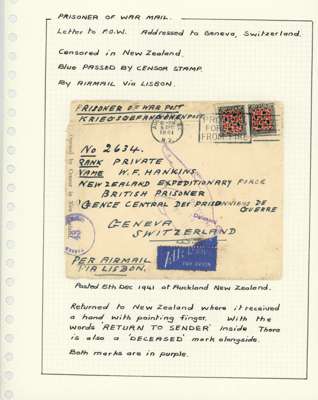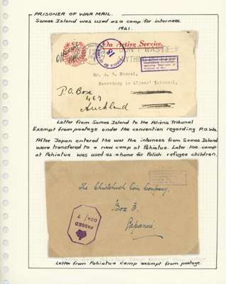 POSTAL HISTORY: 1939-45 WWII Military and Censored Mail collection on annotated album pages, Prisoner of War Post aerogrammes, 1943 1s used to Italy, 1945 1s 6d surcharged to GERMANY. Internee mail from Sames Island Camp (2). Active service envelopes from Egypt to New Zealand (2). Prisoner of War mail to member of New Zealand Expeditionary Force with “Return to Sender” and “Deceased” handstamp etc., a fine diverse selection (56 items)