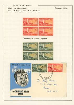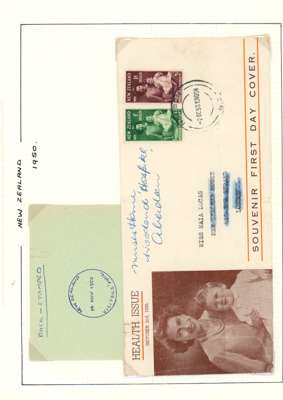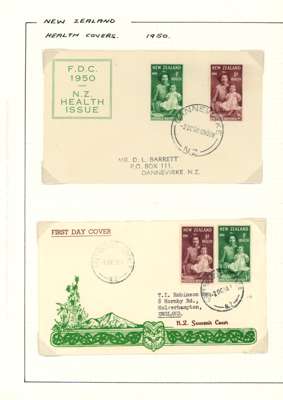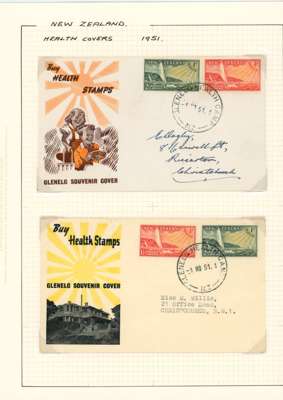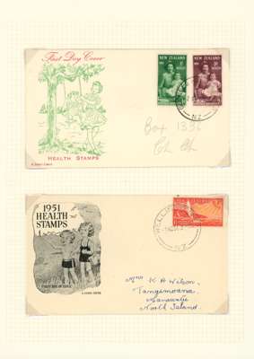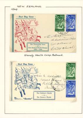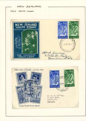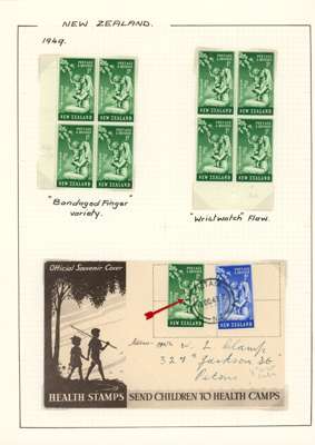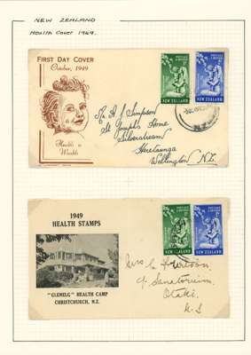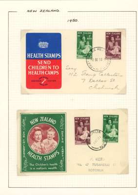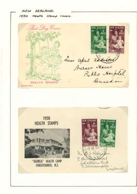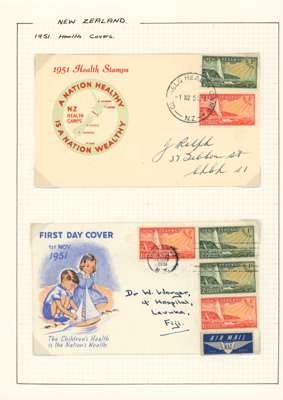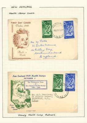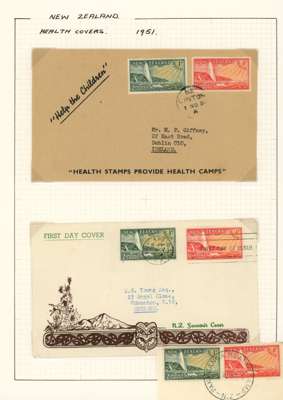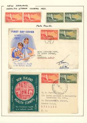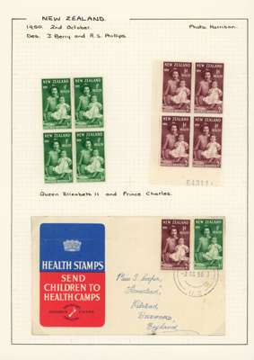 1949-51 Health issues collection on leaves. 1949 with wristwatch and no stop varieties mint and on FDCs (two of the 2d + 1d no stop, plus used block), nine other FDCs. 1950 with Harrison presentation card, copy of the Marcus Adams photo from which the design was taken and ten FDCs, one being a long cover in brown and red showing Queen and Prince Charles (scarce). 1951 with horizontal Plate Proof pairs and 14 FDCs, all in all a good lot
