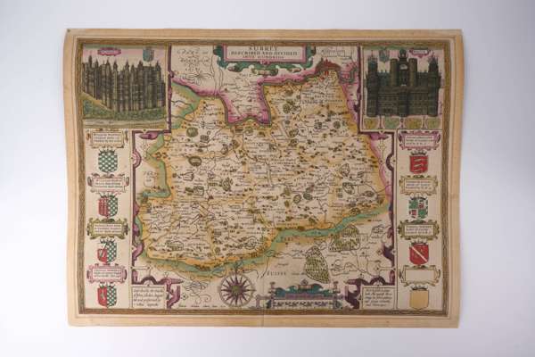 John Speed's map of Surrey was engraved by Jodocus Hondius in 1610 and first published in 1611 in Speed's celebrated atlas 'The Theatre of the Empire of Great Britain.' in 1616 a few copes were published for the European market with Latin text replacing English on the reverse of the map. Exceptional quality of the contemporary colour.