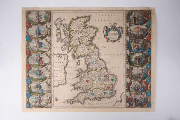 The Anglo-Saxon Heptarchy with panels depicting the conversion of the Anglo-Saxon Kings, in original colour. An antique map, 17 x 21in. Published in Amsterdam, 1650.