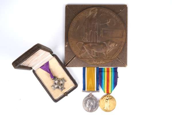The Canadian Memorial Cross, Memorial Plaque Group of 4 awarded to Private Richard Patrick Callaghan 24th Battalion Canadian Infantry who was Killed in Action on the 10th of August 1918 comprising, 1914-1920 British War and Victory Medals, (1054453 Pte. R. P. Callaghan. 24- Can. Inf.), Memorial Plaque (Richard Patrick Callaghan), Candain Memorial Cross, GVR, (1054453 Pte. R.P. Callaghan), very fine (4)