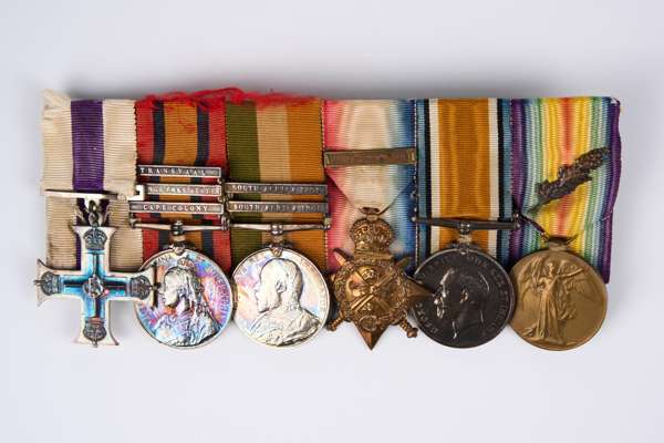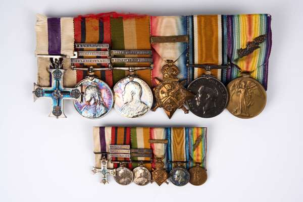 The Rare Capture of Jerusalem Military Cross group of 6 awarded to Major Brereton Charles Dalton Nash Wortham Yorkshire Regiment and 9th Lancers who was probably wounded in the 9th Lancers Charge at Eclogues, 24th August 1914 and was awarded the Military Cross for distinguished services in the Field in connection with Military Operations, culminating in the capture of Jerusalem comprising, Military Cross, G.V.R., unnamed as issued; Queen’s South Africa 1899-1902, 3 clasps, Cape Colony, Orange Free State, Transvaal (Lieut. B. C.D. Nash-Wortham, Yorks. Regt.); King’s South Africa 1901-02, 2 clasps, South Africa 1901, South Africa 1902 (Lieut. B.C.D. Nash-Wortham, Yorks. Regt.), engraved in running script, these two late issues; 1914 Star, with Aug-Nov clasp (Capt. B.C.D. Nash-Wortham. 9-Lrs.); 1914-1920 British War and Victory Medals, M.I.D. oak leaf (Major B.C.D. Nash-Wortham.), mounted court style as worn; together with a similarly mounted set of six miniature dress medals, good very fine (10)